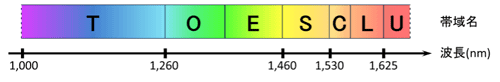 光通信用途で利用可能な波長帯は、C帯(Conventional band、波長1,530〜1,565 nm)とL帯(Long wavelength band、波長1,565〜1,625 nm)、そのほかにT帯(Thousand band、波長1,000〜1,260 nm)、O帯(Original band、波長1,260〜1,360 nm)、E帯(Extended band、波長1,360〜1,460 nm)、S帯(Short wavelength band、波長1,460〜1,530 nm)、U帯(Ultralong wavelength band、波長1,625〜1,675 nm)がある。