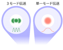 図3 光ファイバ内の3モードと単一モードの光信号伝送