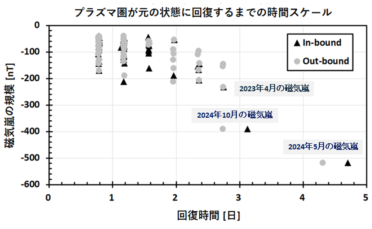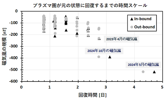 ※7)を組み合わせ、電離圏嵐がプラズマ圏の回復に与える影響を解析しました。あらせ衛星の電子密度データを用いて、磁気嵐後のプラズマ圏の回復過程を詳細に追跡した結果、プラズマ圏の回復に4日以上を要していたことがわかりました。過去77例の磁気嵐におけるプラズマ圏の回復時間を調べたところ、今回の事例では、プラズマ圏の回復時間が極端に長いことが判明しました。GNSS受信機観測網によるTEC解析では、北半球全域で電離圏電子密度が50~90%減少していました。今回の観測でプラズマ圏の回復に時間がかかった原因は、電離圏からプラズマ圏へのプラズマ供給が抑制されたことによるものと、結論づけられました。