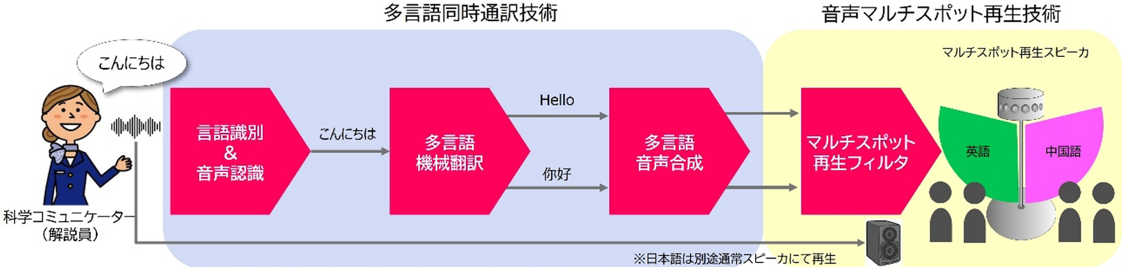 国立研究開発法人情報通信研究機構(NICT、理事長: 徳田 英幸)、NTTデータカスタマサービス株式会社(代表取締役社長:稲村 佳津子)および日本科学未来館(所在地:東京都江東区、館長:浅川 智恵子)は、2025年12月17日(水)から同月25日(木)までの間(ただし、同月23日(火)を除く)、同館において、NICTの音声マルチスポット再生技術※1,2および多言語同時通訳技術※2,3を用いて、「ジオ・コスモス」での科学コミュニケーターによるライブ解説を多言語に同時通訳し、各言語の合成音声が混ざることなく聞こえる音空間を提供する実証実験(以下「本実証実験」といいます。)を実施します。